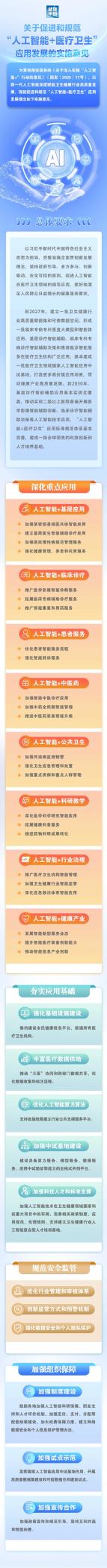 为贯彻落实国务院《关于深入实施“人工智能+”行动的意见》(国发〔2025〕11号),以新一代人工智能深度赋能卫生健康行业高质量发展,现就促进和规范“人工智能+医疗卫生”应用发展提出如下实施意见。