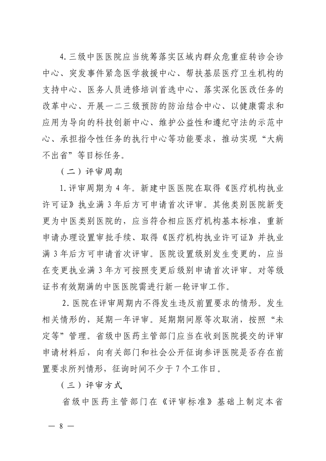 为引导强化中医医院坚持公益性、履行功能定位,全面落实“强基、稳二、控三”工作部署和分级诊疗制度要求,优化完善中医医院评审制度,保障医疗质量安全,提升医疗服务能力、医院管理水平和精细化运营效能,国家中医药管理局组织制定了《三级中医医院评审标准(2026年版)》。现印发给你们,请遵照执行。